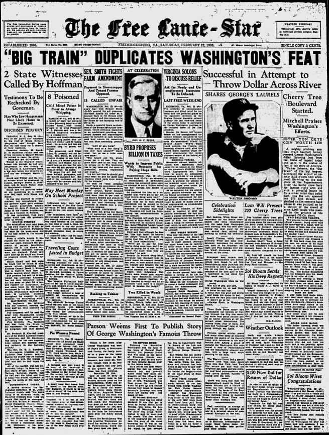 The feat has actually been duplicated, most famously by Walter “Big Train” Johnson, celebrated pitcher for the Washington Senators, on a Depression-era February day in 1936. Officials in charge of that year’s birthday celebration at Ferry Farm challenged the retired Major League right-hander, raising the ire of Congressman Sol Bloom of New York, who believed the story of Washington’s toss, to be “preposterous.” Quoted in the February 18, 1936 edition of The Free Lance Star, Bloom felt the feat “physically impossible” because “Washington was about 10 years old when the miracle was supposed to have happened.” Perhaps, he forgot that George lived at Ferry Farm well into his late teens?