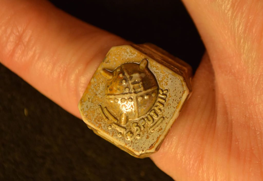 In 2014, Ferry Farm archaeologists unearthed a tangible prize from this moment: a plastic toy “Sputnik” finger ring. Remember that Ferry Farm remained home to a variety of individuals and families in the centuries since the Washingtons lived there. The flashy gold-colored ring, originally dispensed from a gumball machine, featured an idealized image of the satellite and the word “SPUTNIK.” It was no doubt cherished by its original owner, and envied by the prospective young space explorer’s friends.