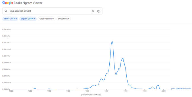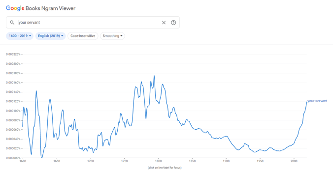 During the 18th century, the most common valedictions – defined as statements made as farewells – were variations on the letter’s author referring to themselves as the servant of the recipient. To determine the popularity of this “servant valediction” and its variations, I used Google Books Ngrams to search their database of books and see how many times various valedictions were used over time. While Ngrams searches books and not all letters from the time, it can still give us a good idea of how common each phrase might have been.