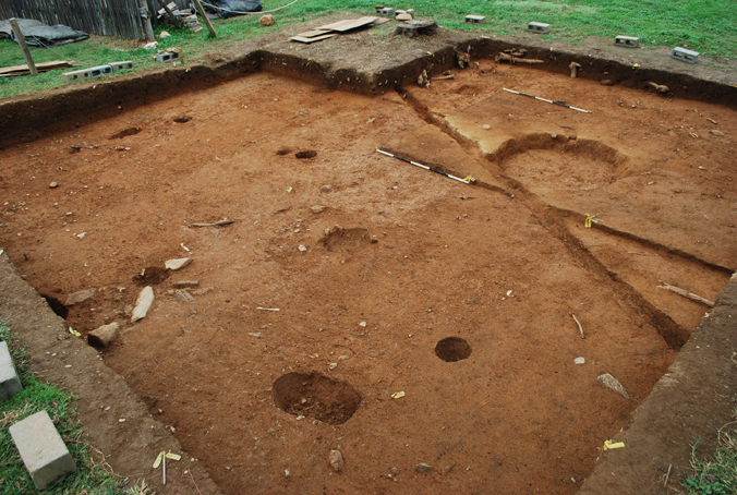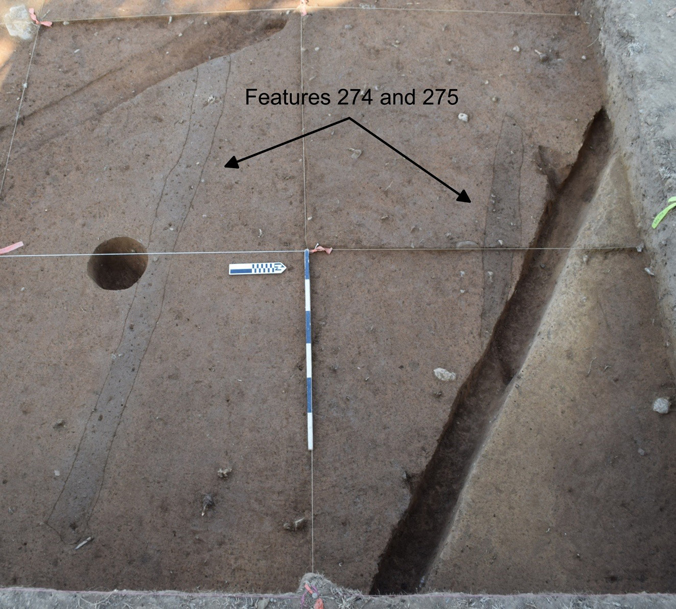 We uncovered numerous new features dating from the 20th century back into prehistoric Native American times. Modern gas and electric lines crisscrossed the site on their way to a now-demolished early 20th century house. They cut through multiple historic layers and sometimes through intact earlier features. Eighteenth century features we excavated included a large, circular, flat-bottomed pit, 5 feet in diameter. The pit’s purpose is still under investigation. A 10-foot long linear feature, obviously related to last year’s still unknown Features 274 and 275, was also found just to their northwest, adding to their mystery.