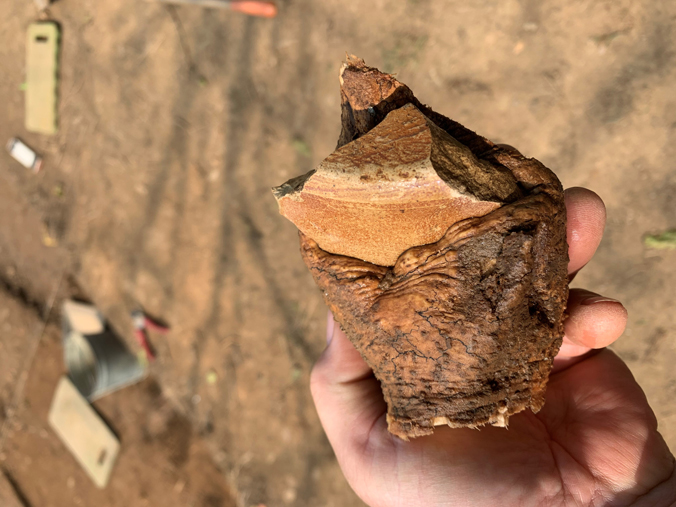 Hundreds of artifacts, of course, were collected during our three-month dig, including wig curler fragments, Native American projectile points, and Civil War bullets. We also found lots of historic ceramics and glass and architectural items, including this stoneware pot base fragment wrapped within a large tree root pictured below.