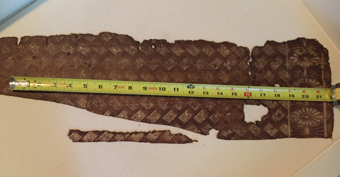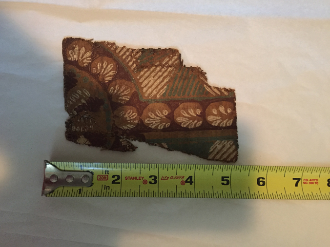 The second clue found during the restoration was a group of larger floorcloth fragments under the attic floorboards. These fragments were large enough that we could see a pattern and color scheme. While obviously from a floorcloth, dating them was a little harder. Floorcloths were used in American households from the mid-18th century through the mid-19th century. Was this floorcloth old enough to have been used during the Lewis era at Kenmore? To narrow down the date range, samples from the green painted areas on the fragments were once again put under a microscope. Prior to 1816, green pigmented paint did not have chrome yellow in its composition. Analysis confirmed an absence of chrome yellow, meaning the floorcloth dated to before 1816. While not a conclusive date, it certainly moved the possible date range closer to the Lewis occupation of Kenmore.