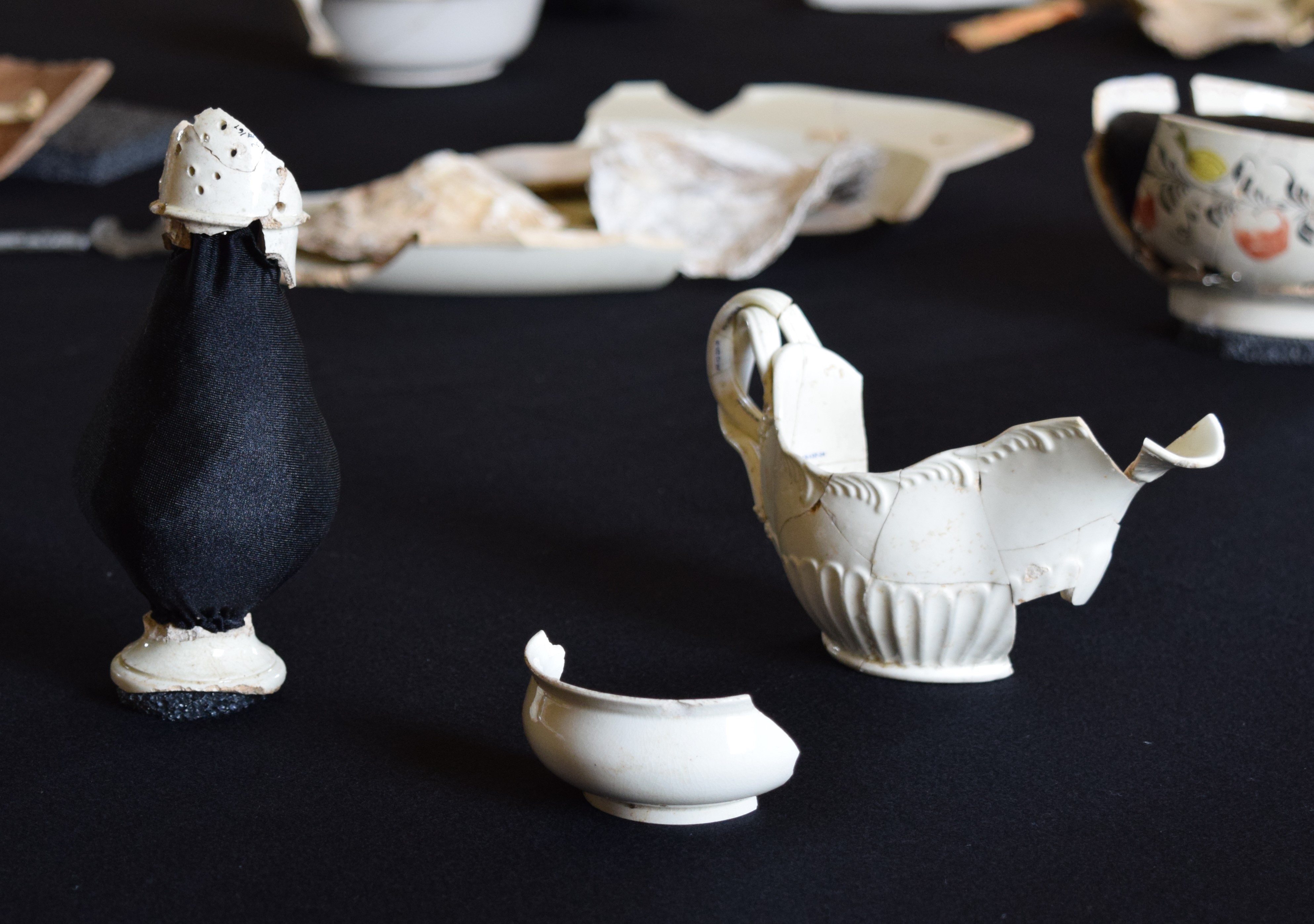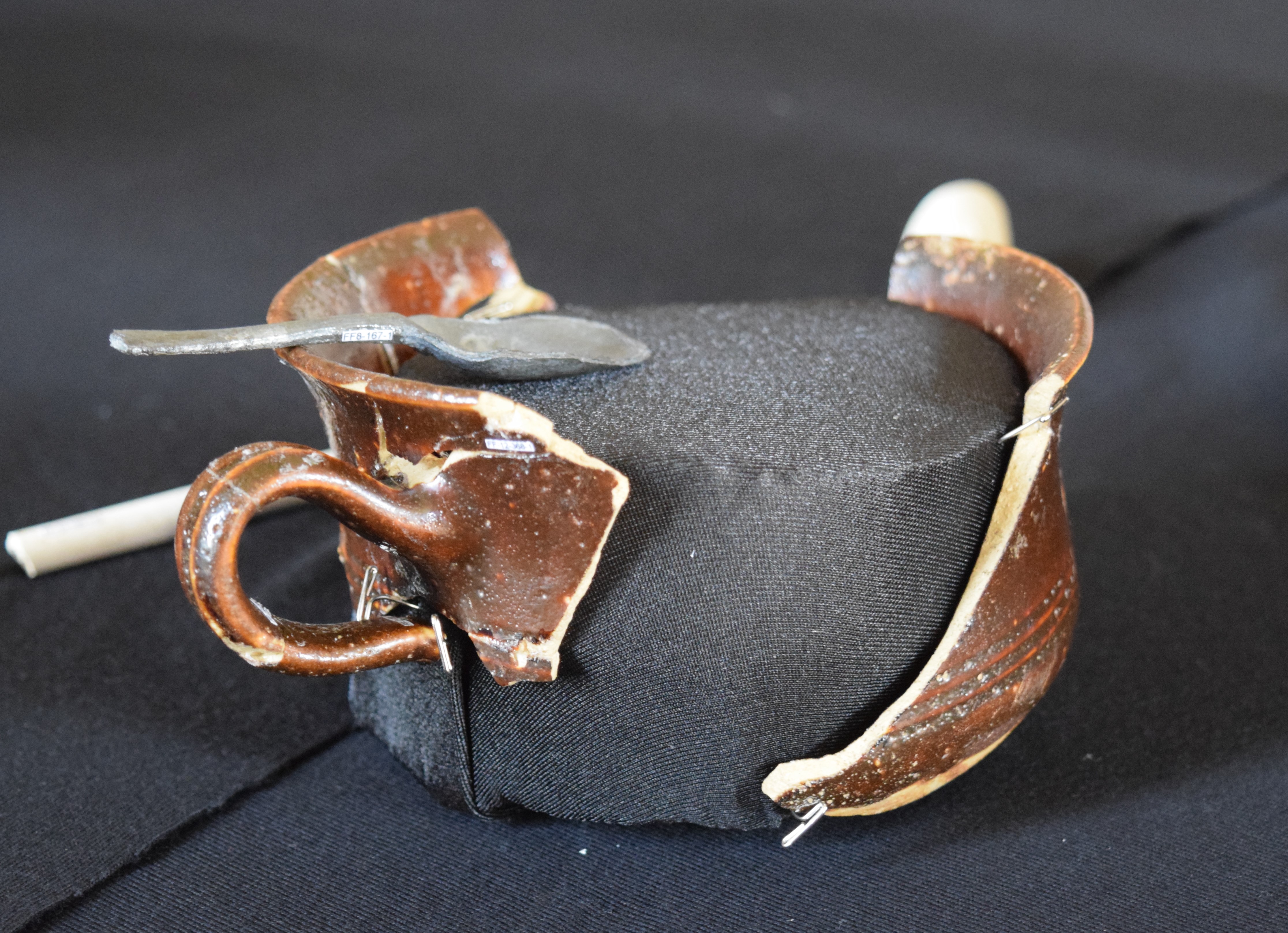 To help envisage the original shape of some of the fragmented vessels and make them recognizable, we first sculpted their shapes out of foam, covered them with fabric, and then attached the incomplete vessel fragments in their correct positions. This process allowed us to present a more “complete” and familiar view of some of the tablewares, such as the two large stoneware jugs, the creamware pepper pot, the glass tumbler, and the two wine bottles. All of these items would have been very difficult to display simply using the fragments themselves.