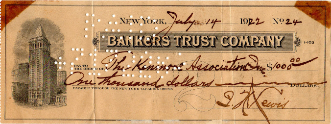 Mrs. Fleming and Miss Annie began fundraising immediately. They wrote hundreds of letters by hand, stating facts about Kenmore in a simple, forceful style and then making appeals for help. Mrs. Fleming recalled, “I could write thirty-nine letters a day and Annie forty-nine. We never had a typewriter until the campaign was over.” In response to one of Mrs. Fleming’s letters, Colonel Isaac Newton Lewis, maker of the Lewis machine gun and a descendant of Fielding Lewis, contributed the first $1,000. Not to be outdone, The Colonial Dames of America in the State of Virginia gave a substantial donation of a $1,000 as well.