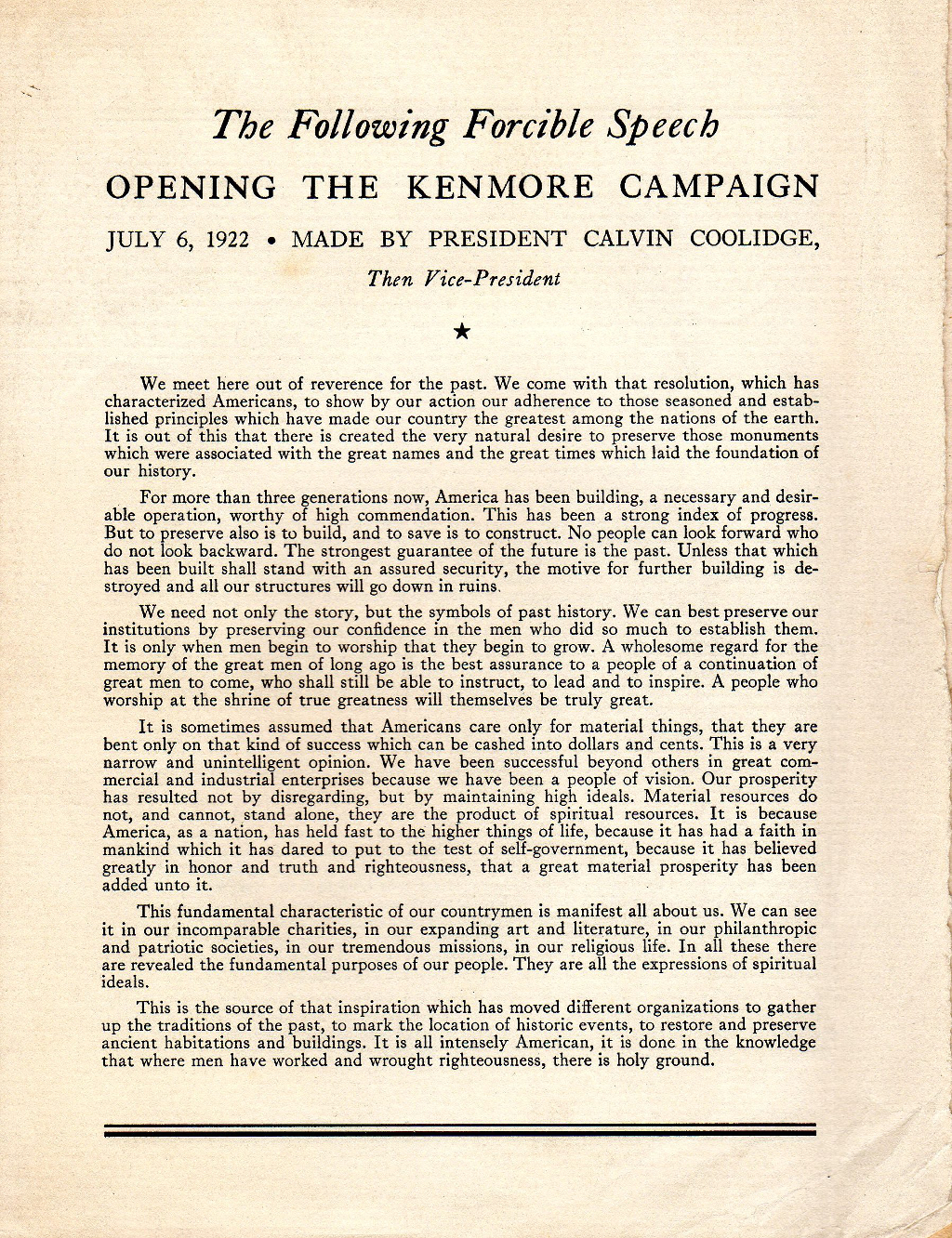Speech made by Vice President Calvin Coolidge in support of the Kenmore Association’s effort to save the historic home.