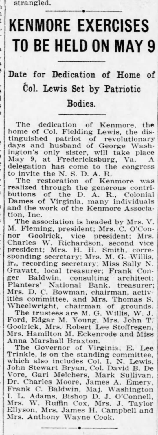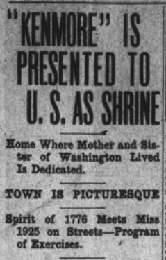 [i] ”Kenmore” is presented to U.S. as shrine. (1925, May 9). The Richmond News Leader, Number 8690 Page 1.
