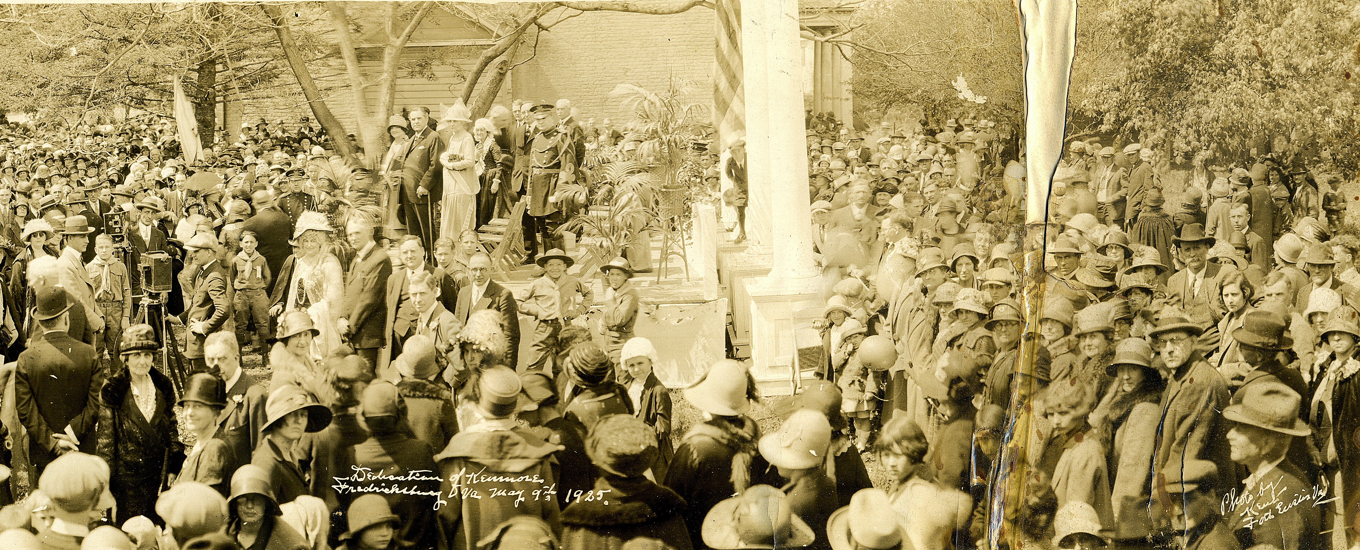Spring is a busy time of year for historic house museums, as we see an influx of school groups, vacationers, and families taking advantage of the beautiful weather. This spring is an especially exciting year at Historic Kenmore since we are preparing to celebrate our centennial anniversary! As discussed in our previous blog post, it is thanks to the efforts of Emily White Fleming, her daughter Annie Fleming Smith, and the Washington Lewis DAR chapter, that Kenmore was saved from development in 1922. In honor of the centennial, we have installed a new exhibit in the Crowninshield Building Visitor Center that explores Kenmore’s preservation history. One image currently on display is a photograph from May 9, 1925, Kenmore’s dedication day.
