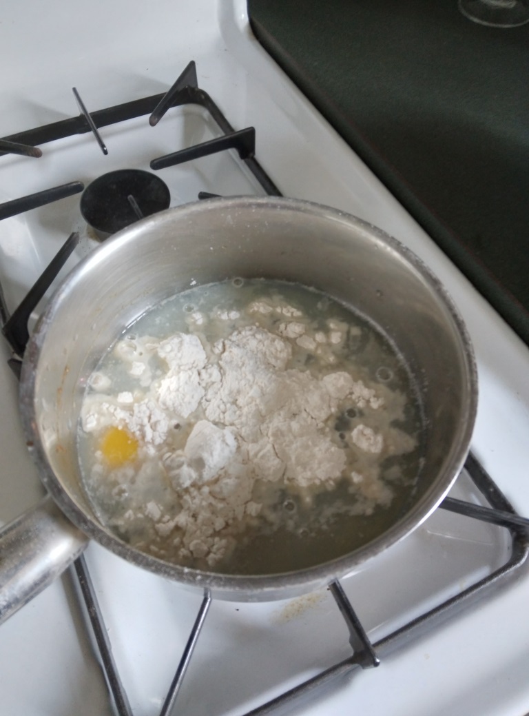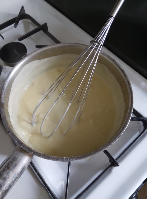 Fifth Step: add the other 1/3 of the oysters to the liquid, along with a few tablespoons of flour, eggs, and cream. Simmer until it thickens but make sure not to burn or let it curdle.