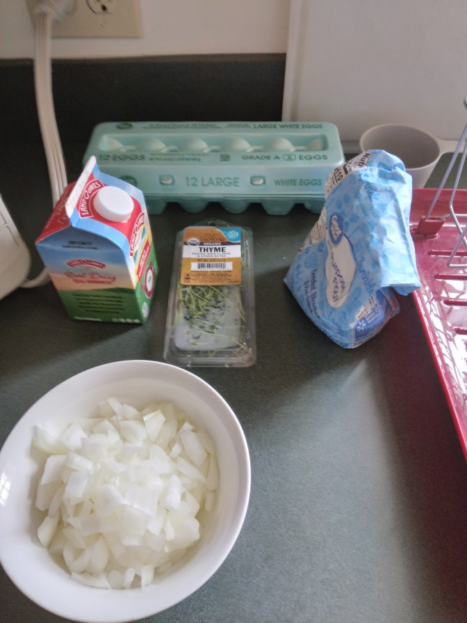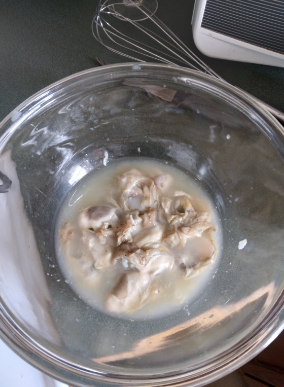 First Step: we gathered our ingredients, including onions, cream, flour, eggs, and oysters