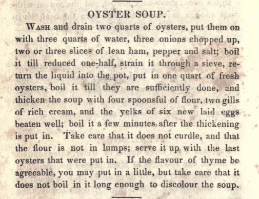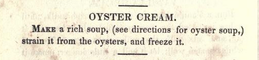 The first and only recipe for oyster ice cream was printed in Mrs. Randolph’s book The Virginia Housewife, published in 1824. The Virginia Housewife was a singular work focused on Virginia produce and cooking practice. It became a model of nineteenth-century Southern American cookery.[11] But the publication of the recipe and the subsequent disappearance of it from history has confused historians for ages. No one is sure why oyster ice cream or where it would be served during dinner. Was it a dessert or a palette cleanser, was it served in place of soup? Was it popular, and if not, then why include it in the cookbook?