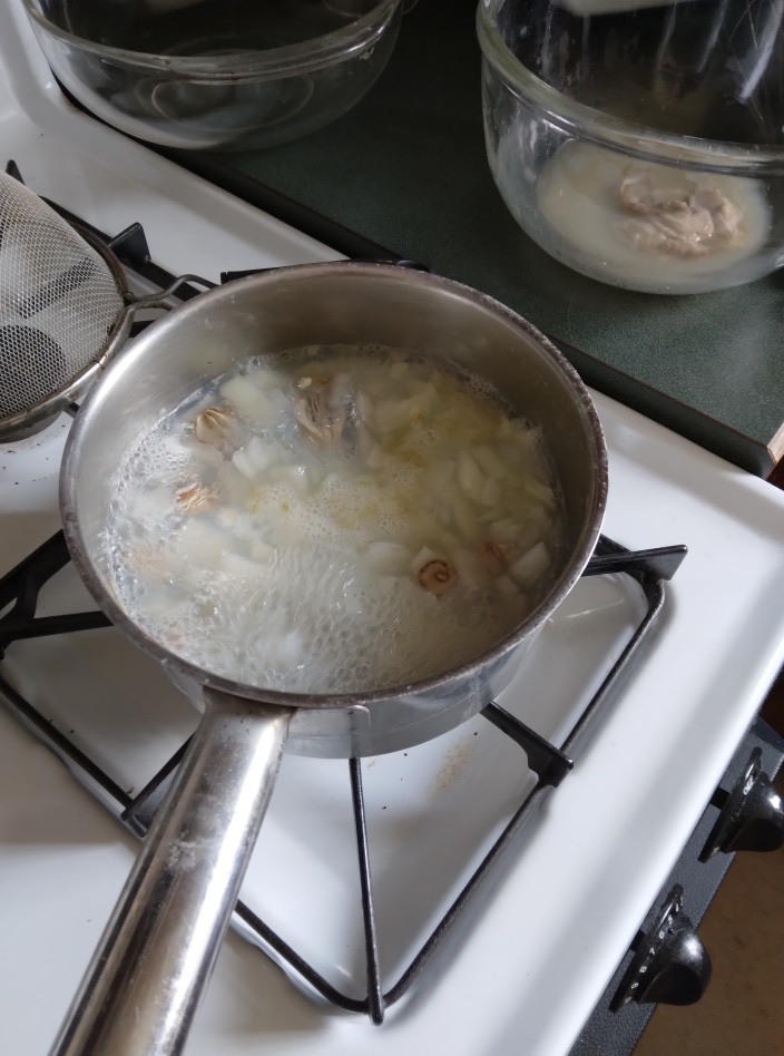 Third Step: We put 2/3 of the oysters in a boiling pot of water with ½ a yellow onion and let that simmer until the water was reduced by ½.