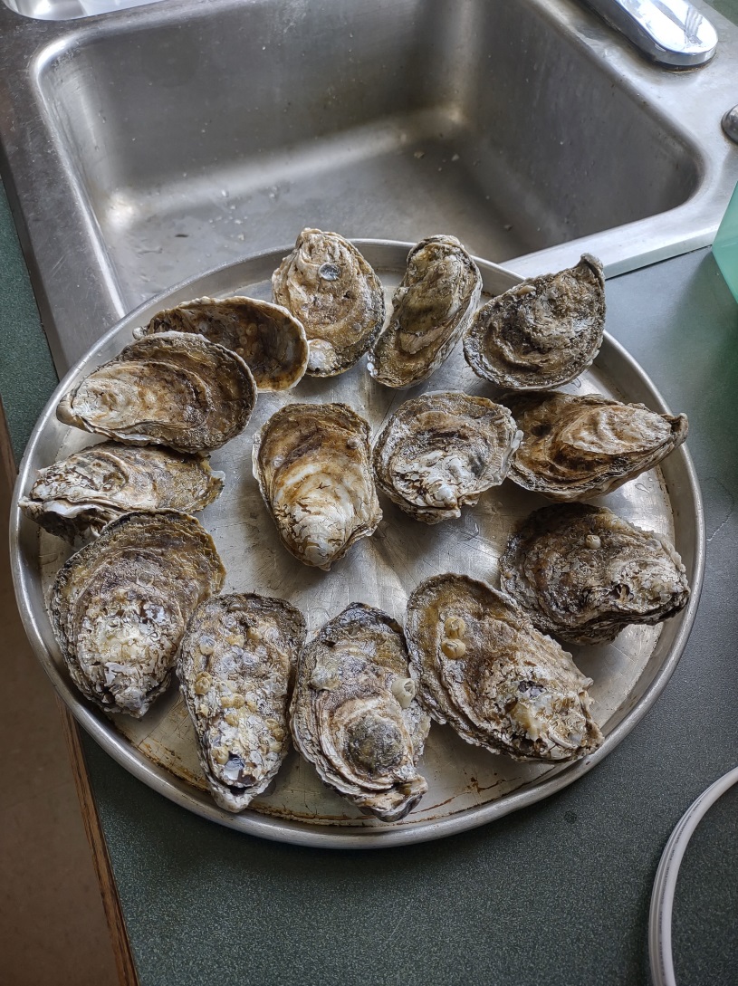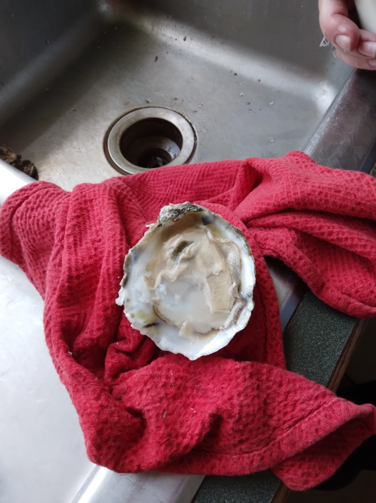Second Step: shuck oysters. Luckily our fearless Archaeology Lab Manager and super fan of oysters, Mara Kaktins, and her deft hands were able to shuck the oysters in minutes.