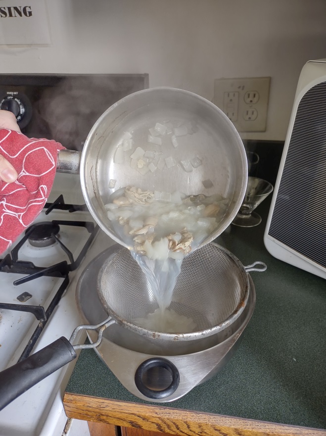 Fourth Step: Drain liquid, removing cooked oysters and chopped onions. Keep liquid and return it to the pot for the next Step.
