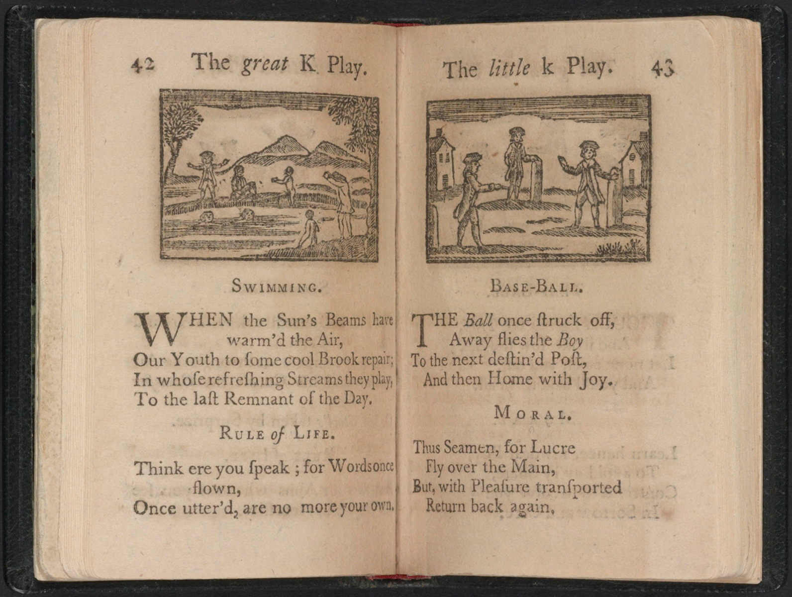 A Little Pretty Pocket-Book, a children’s book published in 1744 by John Newbery, depicts some games and activities from the 18th century that today’s children are likely still familiar with, like flying kites, hopscotch, and leapfrog. Other games may be less familiar to some readers, such as “Tip Cat,” a game similar to cricket where a large stick is used to strike a smaller piece of wood into the air, and “Peg Farthing,” a game involving wooden spinning tops. An interesting fact for sports fans is that Newbery’s little book contains what is believed to be the first printed reference to baseball. The Pocket Book’s illustration for “base ball” depicts three boys standing next to their “post” or base.