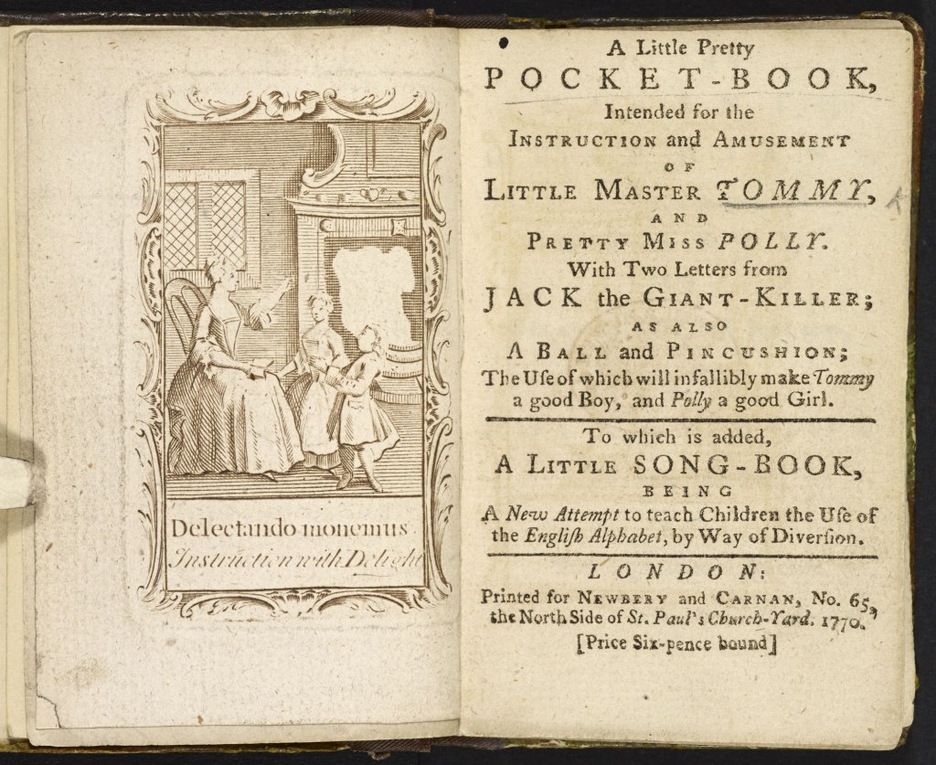 [3] Thomas, I. & Miniature Book Collection. (1787) A little pretty pocket-book: intended for the instruction and amusement of little Master Tommy, and pretty Miss Polly: with two letters from Jack the giant-killer, as also a ball and pincushion, the use of which will infallibly make Tommy, a good boy, and Polly a good girl: to which is added, A little song-book, being a new attempt to teach children the use of the English alphabet, by way of diversion. Printed at Worcester, Massachusetts: by Isaiah Thomas, and sold, wholesale and retail, at his bookstore. [Pdf] Retrieved from the Library of Congress, https://www.loc.gov/item/22005880/.