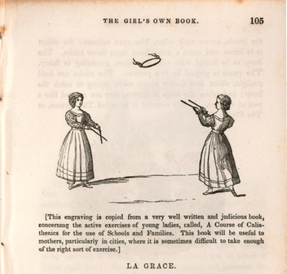 Two books published in the 19th century illustrate the game of graces: American Girl’s Book by Eliza Leslie, published in 1831, and The Girl’s Own Book by Lydia Maria Child, published in 1833. Both authors mention particular benefits of the game, such as encouraging healthy exercise, graceful movements, dexterity and coordination, and of course, fun!