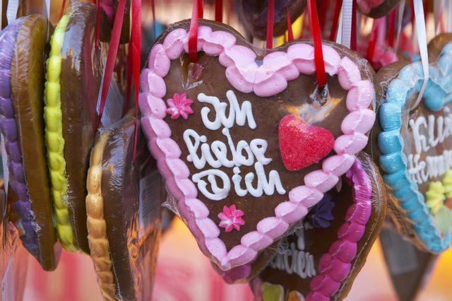 Today, although recipes vary, lebkuchen ingredients often incorporate some variation of honey, nuts, coriander, cloves, ginger, nutmeg, and candied fruit. “Nuremberg lebkuchen” has a higher nut content than any other variety. “Lebkuchenherzen” (or “Lebkuchen hearts”) are heart-shaped gingerbread decorated with written icing inscriptions. The hearts can be hung as decoration and are often sold at Christmas markets and during Oktoberfest.