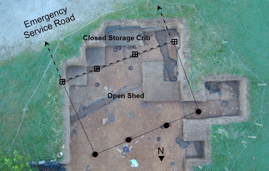 The excavation of the entire structure, particularly the southernmost wall of the storage shed, was hindered by the existence of the emergency access road that was installed at Ferry Farm in 2018. So while we have the entire open shed portion of the corn crib, only half of the storage portion has been uncovered – the rest remains below the current entrance road.