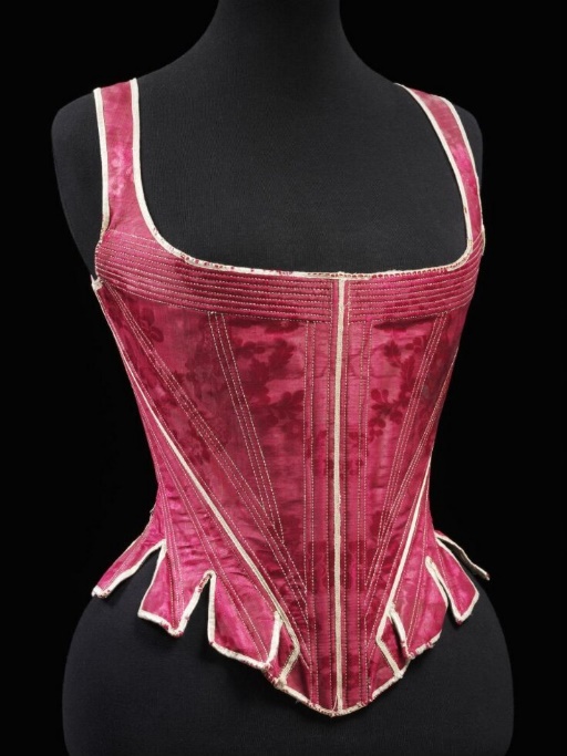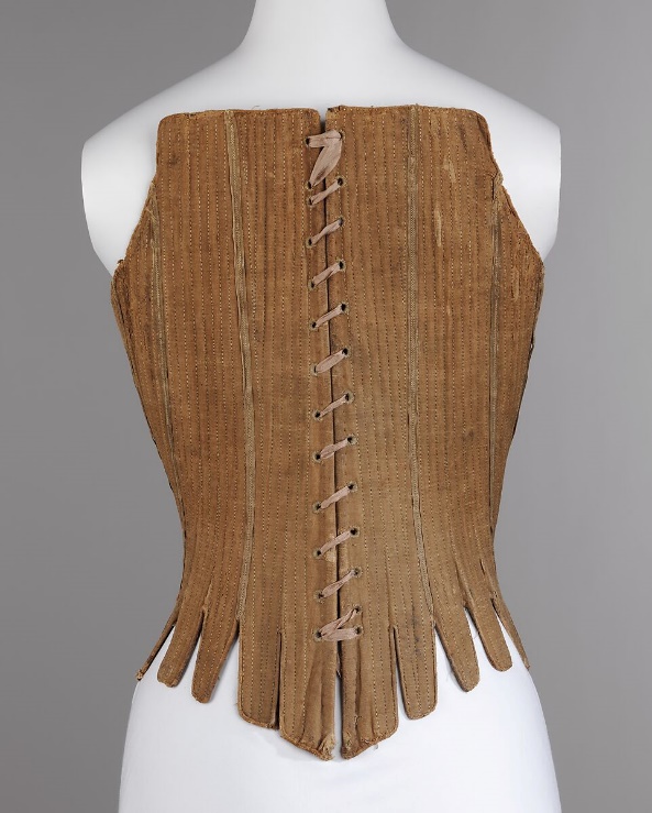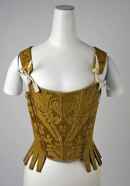 I would like to start by differentiating between stays and corsets. Stays are the fully or partially boned shaping garments worn by women in the 18th century. Stays gave support to the bust and created an inverted conical shape by holding the shoulders back, trimming the waist, and supporting the mantua, or gown. Stays can be laced in the front, back, or both. Corsets became fashionable in the early to the mid-19th century. Corsets give the more famous hourglass shape, are laced in the back, and fastened in the front with hooks. I will be focusing on 18th-century stays, but know that many misconceptions about stays and corsets fall into similar categories. Some differences are the spark to the misconceptions, though.