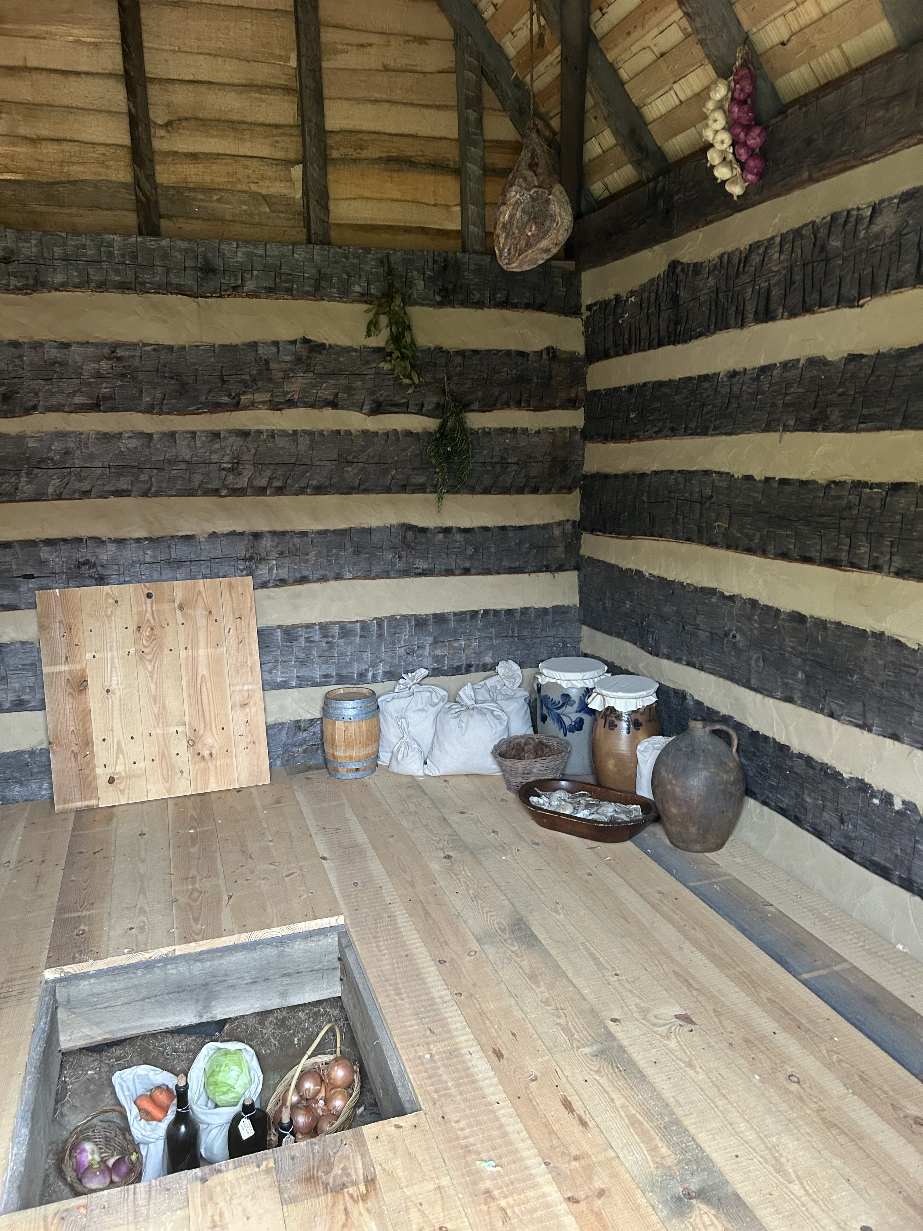 What is a cellar house, you may ask? While explaining it to my 7-year-old son, I told him it is neither a cellar nor a house (by modern standards). At this point, he threw up his arms and gave me up for an imbecilic parent. However, this structure was extremely important for large farms in the 18th century. Picture a simple timber and daub (fancy word for hardened clay) building with four walls, one door, high rafters, no windows, and a three-foot-deep pit beneath its floorboards. It is not fancy or decorative by any standards, yet this building holds preserved food that feeds dozens of people at Ferry Farm during seasons when fresh food is unavailable.