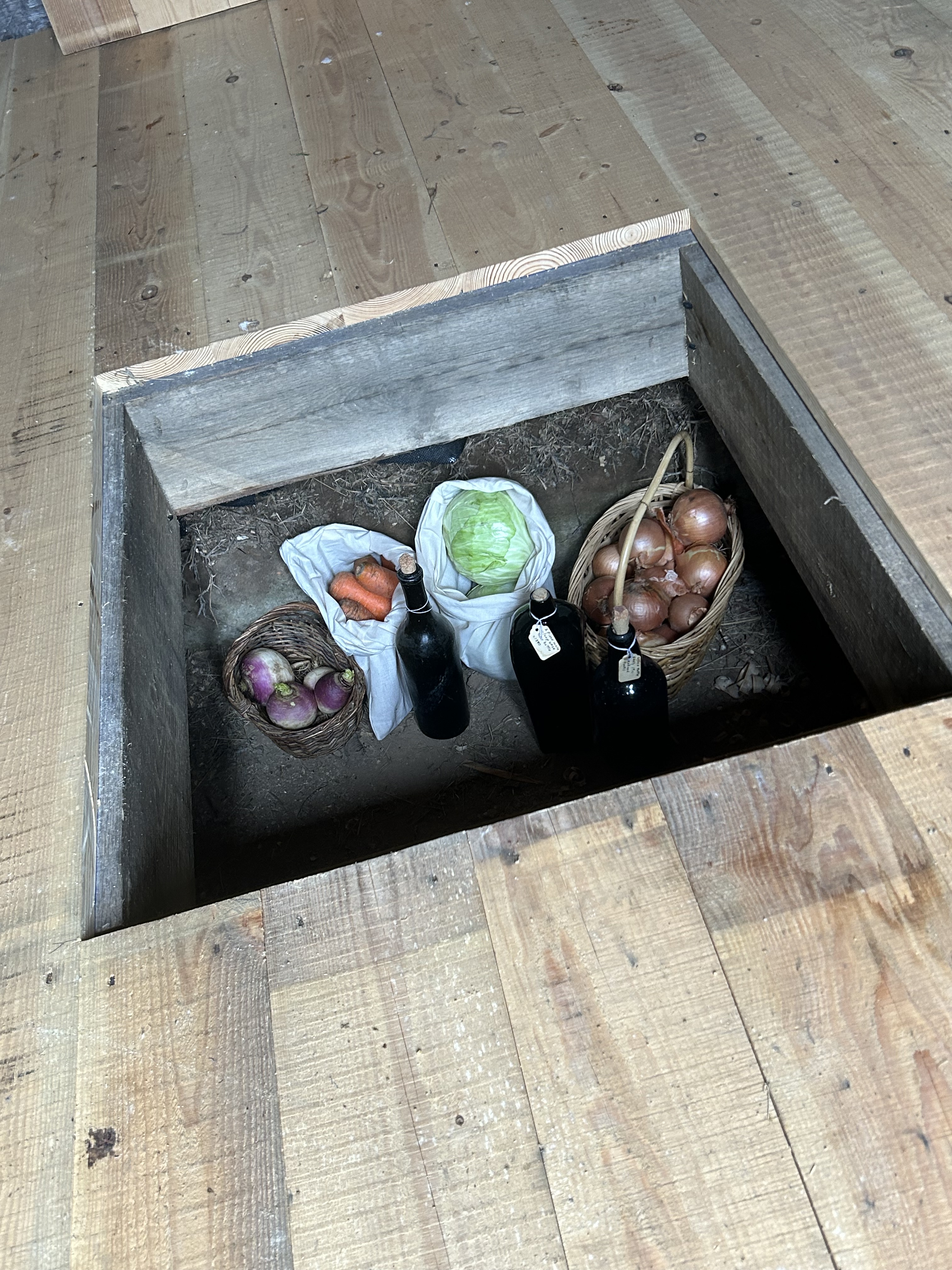 The cellar house could store many different types of foods and beverages, depending on where one kept them in the building. The rafters were ideal for cured meats such as hams, keeping them high and dry. Hooks on the walls held bunches of drying herbs, garlic, and onions. The shelves were perfect for baskets and small crocks of food, while the floor was sturdy for storing large casks or jugs of ale and cider, sacks of grain, and bushels of hardy vegetables and fruits. The pit beneath the floorboards, a glorified ‘cellar,’ was a few degrees cooler in the hot months and a few degrees warmer during the cold season. However, the difference between spoilage and edibility could hinge on maybe 10 degrees, making the subfloor pit essential for colonists who needed to keep some food cooler in summer but warmer (not freezing solid) in winter. Basically, the role the cellar house played varied by the seasons as a revolving door of foods came and went.