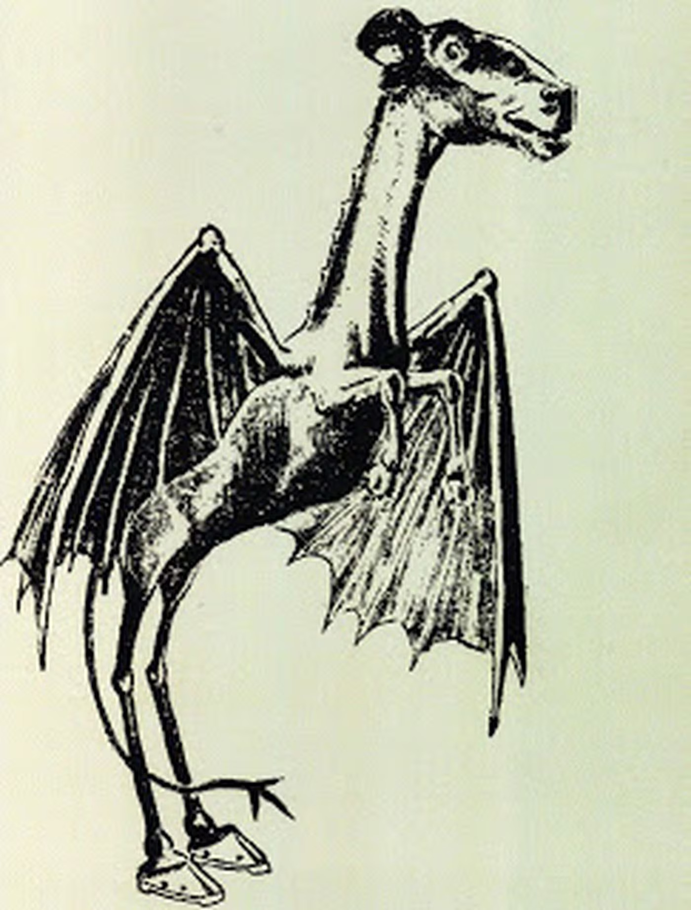 W.F. Mayer’s In the Pines (1859) explores the beginnings of the Jersey Devil. Deborah Leeds’s thirteenth child was born in 1736 in the Pine Barrens in New Jersey. Soon after birth, the child suddenly turned into a horrible wyvern-like creature with a goat’s head, leathery bat-like wings, horns, small arms with clawed hands, legs with cloven hooves, and a forked or pointed tail.