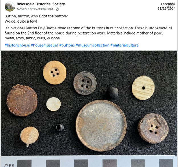 The use of found objects in historic structures to help illuminate the material world of the building’s residents and workers is not a revolutionary concept. Colonial Williamsburg, for instance, in their recent restoration of the historic Bray School, removed modern plaster walls, revealing not only structural information but also artifacts: “We are collecting building fragments and objects found in the walls…These items shed light on the building’s original finishes and various inhabitants since 1760.” Riversdale Historical Society has been showcasing some of their “found” artifacts on Facebook — most recently posting a set of buttons for National Button Day.