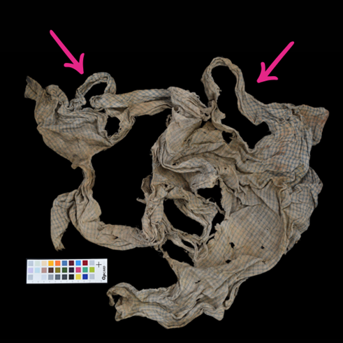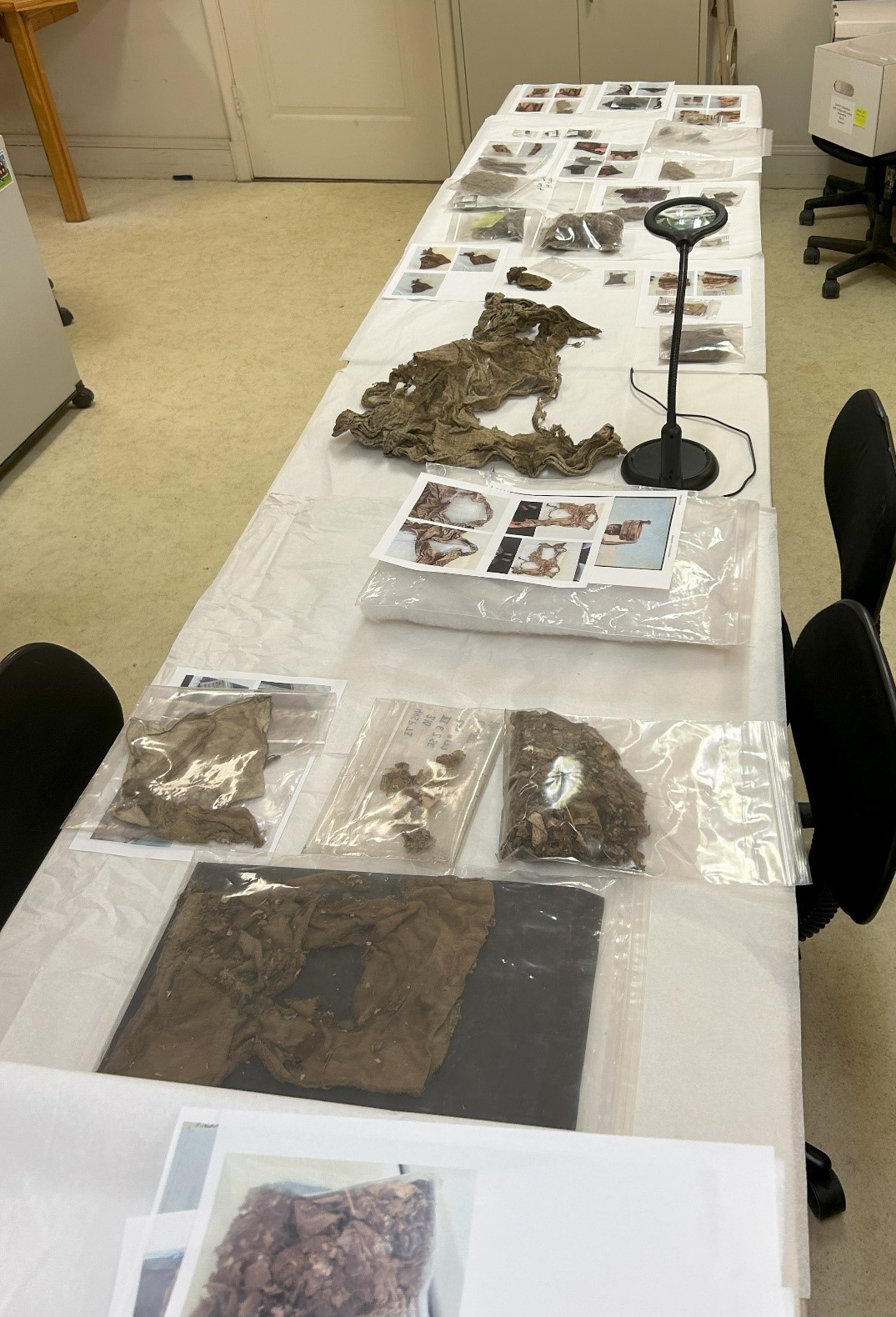 Fast forward to 2024, the artifacts were again reviewed, and the idea blossomed to plan a textile assessment of all the small scraps of fabrics that had been collected. According to our in-house review, we could tell that they dated to a variety of periods and ranged in their likely original use, from costumes to household linens.
