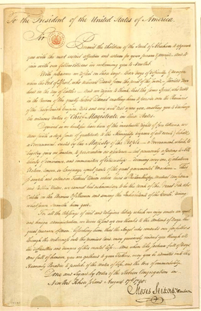 In writing the letter, the congregation wished to express their hopes for the future and receive assurance from their head of state that this future existed. On August 21, Washington replied to the letter thanking them for the “cordial welcome [he] experienced…from all…citizens” while reflecting on the difficulties of the past and how the future promised security. Then, using the congregation’s own words, he wrote that: