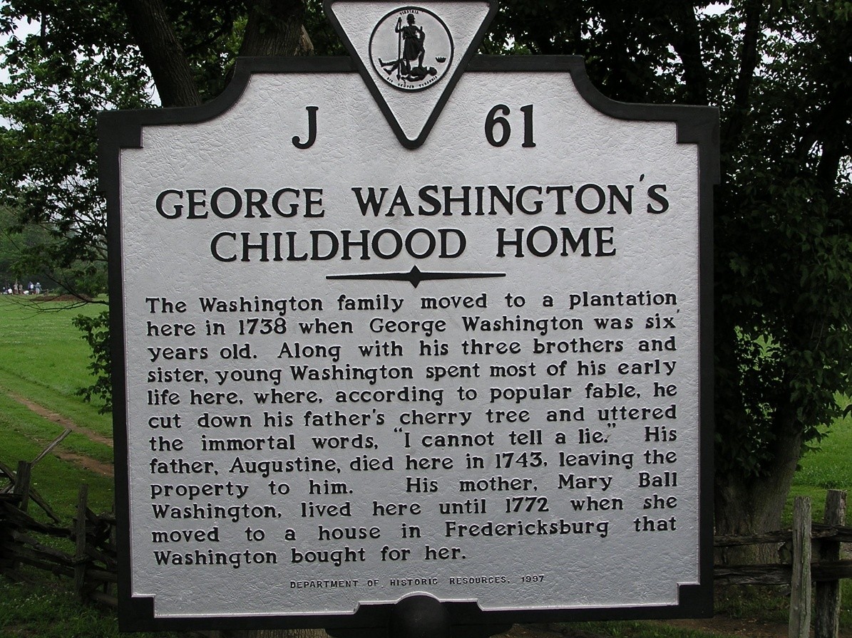 “Washington’s Boyhood Home: At this place, the Ferry Farm, George Washington lived most of the time from 1739 to 1747. Here, according to tradition, he cut down the cherry tree. Washington’s father died here in 1743. The farm was his share of the paternal estate.”