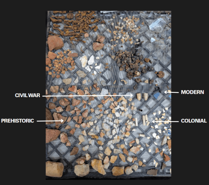 When archaeologists talk about disturbed layers, we aren’t judging their emotional state or love of 2000s heavy metal. Instead, when a layer is described as disturbed, that means there was some sort of activity happening after the initial deposition that affected that layer. During last season’s dig, there were layers with a mix of colonial, prehistoric, and modern materials that indicated that the area was disturbed by some subsequent activity. The information gathered by the presence of modern materials is important for the interpretation of the site and its use over time.