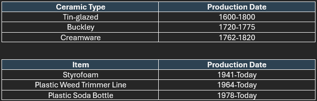 One-way modern materials can help us understand a site is by helping us determine the Terminus Post Quem (TPQ), or “time after which,” of a layer. The TPQ is determined by identifying the earliest production date of the most recently produced item. For layers deposited before the widespread use of plastics, ceramics are usually used for determining the TPQ because they are datable (temporally, not romantically) since most have very specific production dates, and they also hold up pretty well under ground. For example, when looking at the ceramics in a layer with tin-glazed wares, Buckley, and creamware, the TPQ would be 1762 since that is the earliest production date of the most recently produced ceramic (creamware). All the items in the layer had to have been deposited after that date.