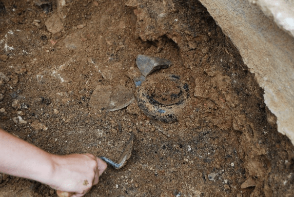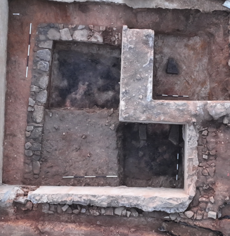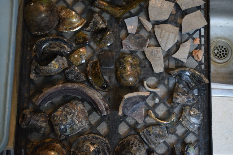 We began last year’s excavation season by uncovering and exposing the entirety of the site, which had been sealed 28 years ago with a protective layer of sand. Exposed was a 16’ square stone foundation to a cellar filled with burnt household and architectural debris. For our excavation plan, we divided the cellar fill into four quadrants and were able to excavate two of them down to the level of the cellar floor over the course of our season. One of the quadrants had previously been excavated in the 1990s, leaving one more quadrant to dig this summer.